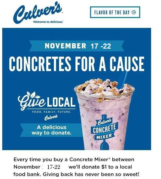 From 11/17 to 11/21 Purchase a Concrete Mixer at Culver’s in Davison, Mi and Culver’s will make a donation to Outreach East !